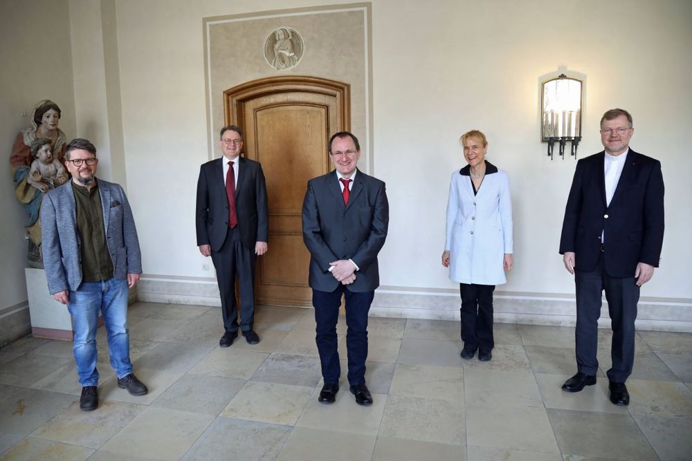 © Kerstin Schmeiser-Weiß (POW) | Abschied von Dr. Thomas Franz (Mitte), Leiter von Theologie im Fernkurs und stellvertretender Direktor der Domschule Würzburg (von links): Dieter Engelhardt von der Mitarbeitervertretung (MAV) der Diözese Würzburg, Dr. Rainer Dvorak, Leiter der Domschule Würzburg, Dr. Christine Schrappe, Leiterin der Hauptabteilung Bildung und Kultur, Generalvikar Dr. Jürgen Vorndran.