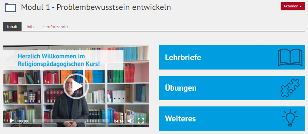 Für jedes Modul gibt es einen eigenen Bereich, in dem die Studierenden die Lehrbriefe des jeweiligen Moduls, digitale Übungen und Trainings zum Kursmaterial zur Verfügung gestellt bekommen. "Weiteres" bietet den Studierenden die Möglichkeit, sich anhand weiterführender Links in Spezialthemen zu vertiefen. Im Modul 1 steht ein einführendes Video zur Verfügung, in dem sich die Kursverantwortlichen vorstellen und den Kurs erklären.