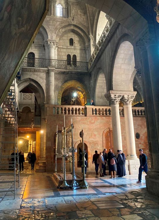 Zurück auf dem Weg Jesu ging es am nächsten Morgen auf den Ölberg, von wo sich der berühmte Panorama-Blick (siehe Foto) auf Jerusalem bietet: überragt von der goldenen Kuppel des Felsendoms, der weder Dom ist noch Moschee, sondern Gebetshaus zum Gedenken an die Stelle, an der Mohammed in Richtung Mekka aufgestiegen sein soll. Immer wieder war diese Studienreise auch Teil eines interreligiösen Dialogs. In der so genannten Tränenkirche („Dominus flevit“ = der Herr weinte) am Rande des Ölbergs zeigte sich einmal mehr raffinierte Kirchen-Architektur: das Kreuz im Fenster liegt in der Perspektive direkt auf der Kuppel der Grabeskirche. Dort waren wir ebenfalls, sowohl im Golgota-Teil, als auch bei den Steingräbern, die von der Kirche aus zu besichtigen sind. Wer mochte, konnte sich auch frühmorgens in die Schlange vor der Stelle einreihen, die als Grab Jesu verehrt wird. Spätnachmittags ging natürlich auch, aber dann war die Schlange noch länger …