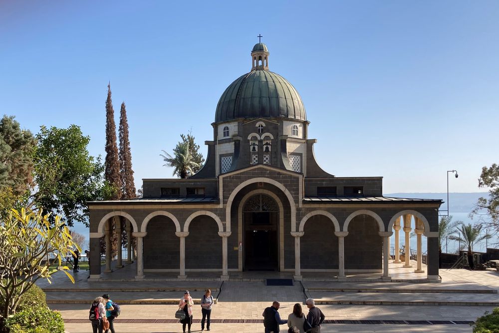 Von Kafarnaum ging es zu Fuß an einer imaginären Zollstelle vorbei (Mk 2,13-17) auf den Berg der Seligpreisungen (Mt 5-7), wo wir mit Blick auf den See eine erste große gemeinsame Bibelarbeit einlegten. Von dort schließlich weiter zu Fuß nach Tabgha (herrlich: gemeinsames Taizé-Singen der immer noch 24 Teilnehmer in der Brotvermehrungskirche) und schließlich ans Ufer des Sees, wo wir diesen ersten, dicht gepackten Tag mit Gedanken über Mt 14,22-33 (Jesus geht über das Wasser, Boot im Sturm, Petrus, der versinkt) abschlossen.