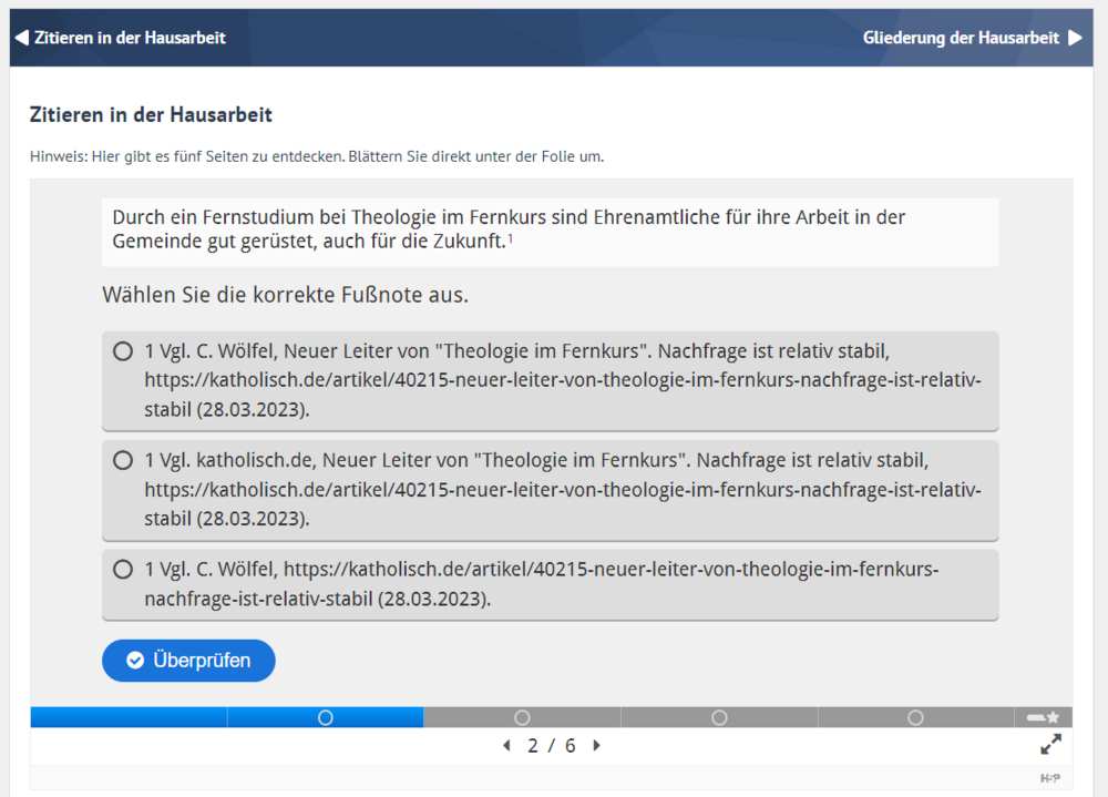 Die Übung zur Erstellung einer Hausarbeit kann von den Fernstudierenden orts- und zeitunabhängig sowie beliebig oft bearbeitet werden. Das System gibt beispielsweise für die Aufgaben zur Zitation sofort eine Rückmeldung, ob die richtigen Optionen ausgewählt wurden. Das unterstützt die Flexibilität, mit der die Fernstudierenden ihren individuellen Studienverlauf für ihren Kurs gestalten können. Wir freuen uns, zusätzlich zum Webinar Hausarbeitstraining und zum Forum Hausarbeiten schreiben nun eine weitere Möglichkeit zur Vorbereitung auf diese Prüfungsleistung anbieten zu können.