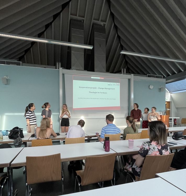 Mit dem Abschluss des Kooperationsprojekts "Change Management" geht ein Semester voller intensiver, interdisziplinärer Zusammenarbeit zu Ende. Ein studentisches Projektteam arbeitete, fachkundig begleitet durch ihren erfahrenen Mentor vom Beratungsunternehmen Breitenstein Consulting, an der Entwicklung von Handlungspaketen für die Bereiche der Studienberatung, der Öffentlichkeitsarbeit sowie der Studienbegleitung bei Theologie im Fernkurs. In ihrem begleitenden Seminar lernten die sechs Studierenden aus dem Change-Management-Seminar des Lehrstuhls für Sozialpsychologie der Ludwig-Maximilians-Universität München wissenschaftliche Grundlagen und Werkzeuge für ihre praktische Aufgabenstellung kennen. Das Projekt profitierte außerdem von den unterschiedlichen Fachrichtungen der Studierenden. Regelmäßige Treffen zwischen dem studentischen Projektteam und ihrem Mentor sowie einer Ansprechperson von Theologie im Fernkurs lieferten weiteren Input und ermöglichten eine gute Abstimmung.
