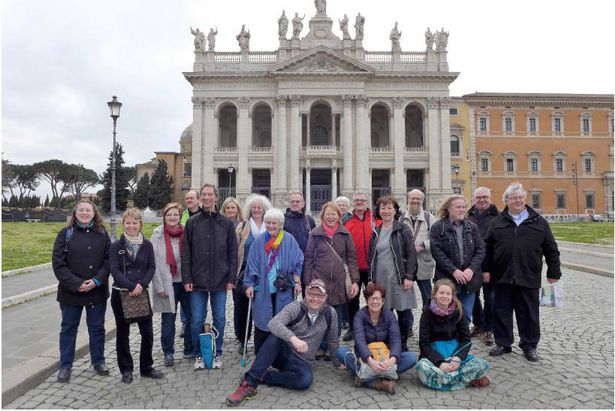 Vor der Lateran Basilika. Von links nach rechts hinten: Gisela Schlotter, Barbara Weneroth, Petra Honig, Edwin Senft, Gerold Mölter, Renate Senft, Cornelia Schächtele, Ursula Pesot-Roether, Jochen Deitert, Ingrid Rupprich, Uta Deitert, Andreas Demling, Monika Frommer, Christian Rupprich, Georg Padberg, Willi Frommer, Franz Heinzmann.