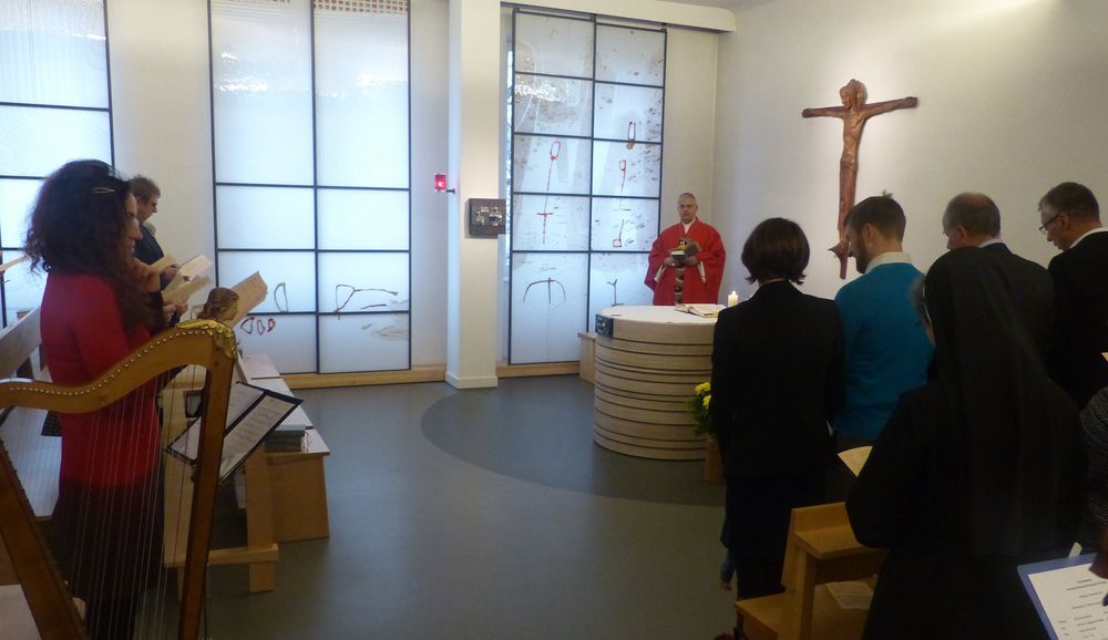 Neben der wissenschaftlichen Auseinandersetzung mit theologischen Fragen war die gemeinsame Feier des Glaubens ein wichtiges Element des Kurses. Bei jedem Treffen gab es gemeinsame Morgen- und Abendgebete, die von den Teilnehmerinnen und Teilnehmern gestaltet wurden, so dass ganz unterschiedliche Formen des Gebets erlebt und gefeiert werden konnten. Auch die sonntäglichen Eucharistiefeiern in der Kapelle des Bildungshauses wurden von den Teilnehmeden vorbereitet und mitgestaltet.