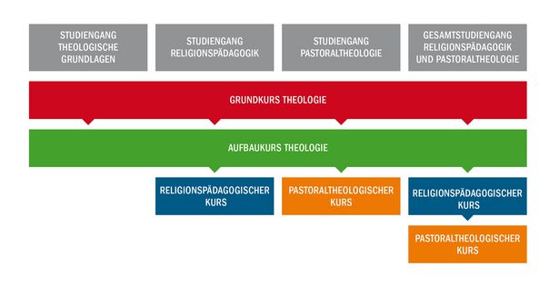 Der Studiengang gliedert sich in zwei Abschnitte: Der "Grundkurs Theologie" soll wissenschaftlich fundierte Kenntnisse der Theologie vermitteln und zu verantworteter Sprachfähigkeit im christlichen Glauben führen. Im "Aufbaukurs Theologie" geht es vor allem um den gelebten Glauben im Kontext der modernen Welt und eine argumentative Auseinandersetzung mit religiösen Lebensfragen. Es ist keine leichte Aufgabe, pro Kurs 24 Lehrbriefe zu studieren und sich neben beruflichen und familiären Verpflichtungen wöchentlich 10 bis 15 Stunden für den Fernkurs freizuhalten. Unterstützend bieten viele (Erz-)Diözesen von Hamburg bis Passau Arbeitszirkel an, in denen die Studierenden den Stoff mit Referentinnen und Referenten wiederholen und vertiefen können.
