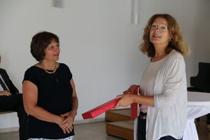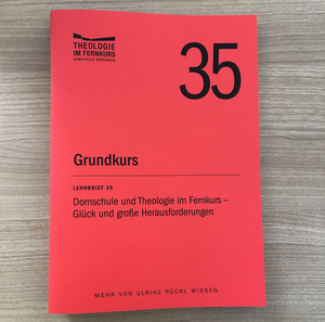 Bei der Verabschiedung hat Ulrike Rückl zwei Geschenke erhalten, die ganz eng mit ihrer Tätigkeit bei Theologie im Fernkurs verbunden sind: einen Lehrbrief mit der Nummer 35 – so viele Jahre hat Frau Rückl insgesamt in der Domschule gearbeitet – mit vier Kapiteln: Berufsstart im „alten“ Burkardushaus, Büroleitung von Theologie im Fernkurs im „alten“ Burkardushaus, die Jahre im Priesterseminar, Rückkehr ins generalsanierte Burkardushaus. Die Mitarbeiterinnen aus der Verwaltung, allen voran Brigitta Gerhart, haben diesen 76-seitigen Lehrbrief über Monate unter den erschwerten Bedingungen der Corona-Zeit in ihrer Freizeit erstellt.