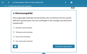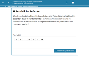 Der digitale Lehrbrief beinhaltet vielfältige Aufgabenformate. Persönliche Reflexionen halten dazu an, das Gelernte auf eine bestimmte Situation zu beziehen oder in einem anderen Kontext zu betrachten. Die Ergebnisse können schriftlich festgehalten und immer wieder abgerufen werden. Umfragen und Stimmungsbilder sind interaktive Aufgabenformate, deren Antworten für alle Lehrbrief-Nutzer einsehbar sind. So kann dem Lehrbriefstudium in Einzelarbeit eine Form des Austausches hinzugefügt werden.