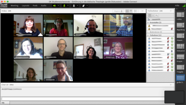 Durch die Einführung von Adobe Connect als neue Software für virtuelle Klassenzimmer im Jahr 2019 sind die technischen Voraussetzungen und Erfahrungen mit dem Tool (Werkzeug) bereits vorhanden. Auch wenn auf diese Ressource ohne Probleme zurückgegriffen werden kann, gibt es für das Team von Theologie im Fernkurs viel zu tun. Eine mehrtägige Veranstaltung im virtuellen Raum erfordert in Verwaltung und Studienleitung eine andere Vorbereitung als die gewohnten Abläufe der Präsenzveranstaltungen. Durch ihre Qualifizierung zur Live-Online-Trainerin bzw. zum Live-Online-Trainer sind die Studienleiterinnen und Studienleiter bestens auf diese Herausforderung vorbereitet.